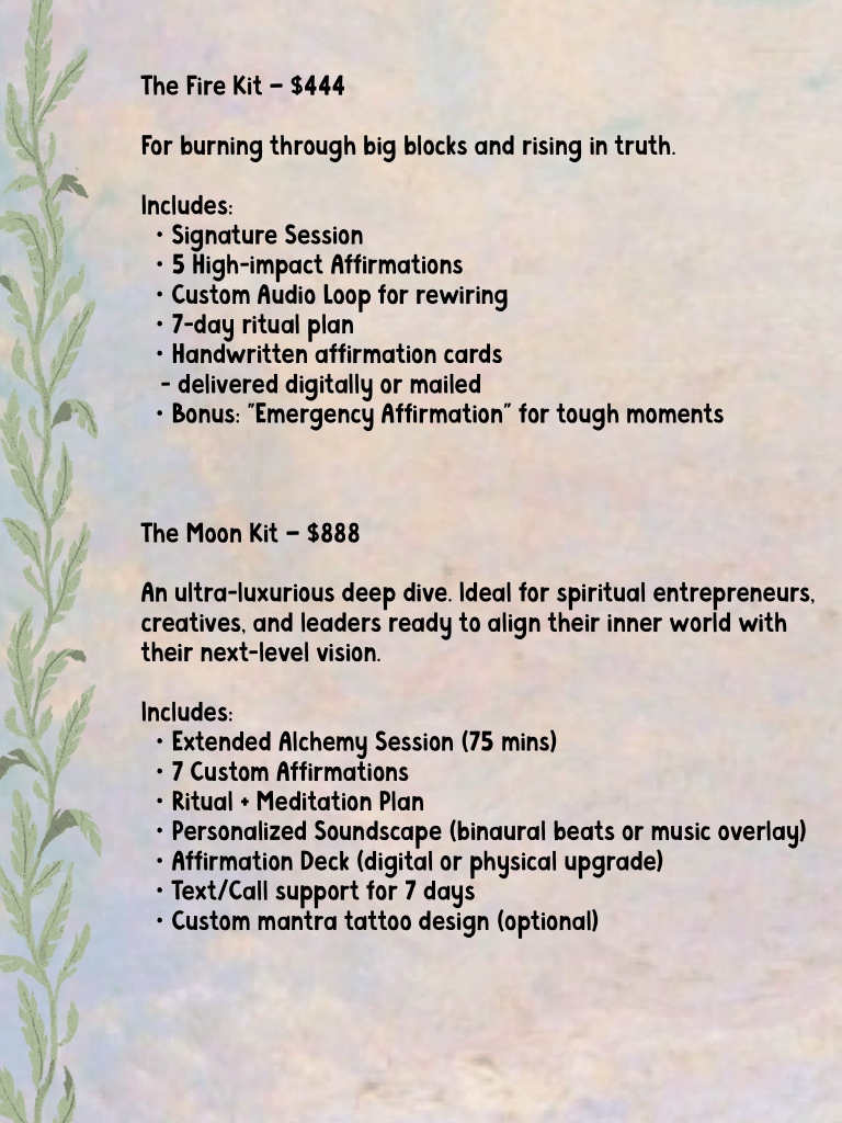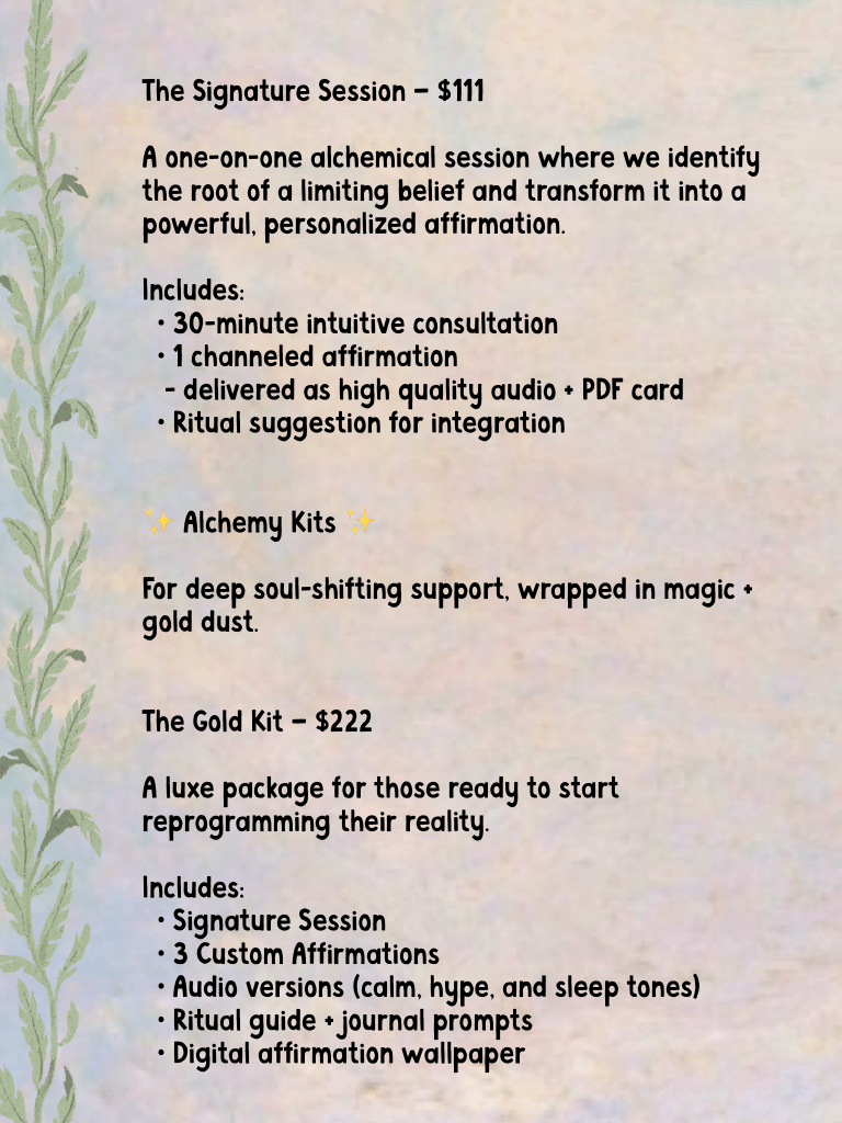 These high-frequency sessions are designed to help you gently—but powerfully—reroute your mindset in real time. Together, we’ll uncover the limiting beliefs at play and transmute them into empowering affirmations that support your highest self.